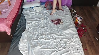 Amateur wife enjoys trying on clothes and cutting them. Amateur wife vacuums naked in the house.